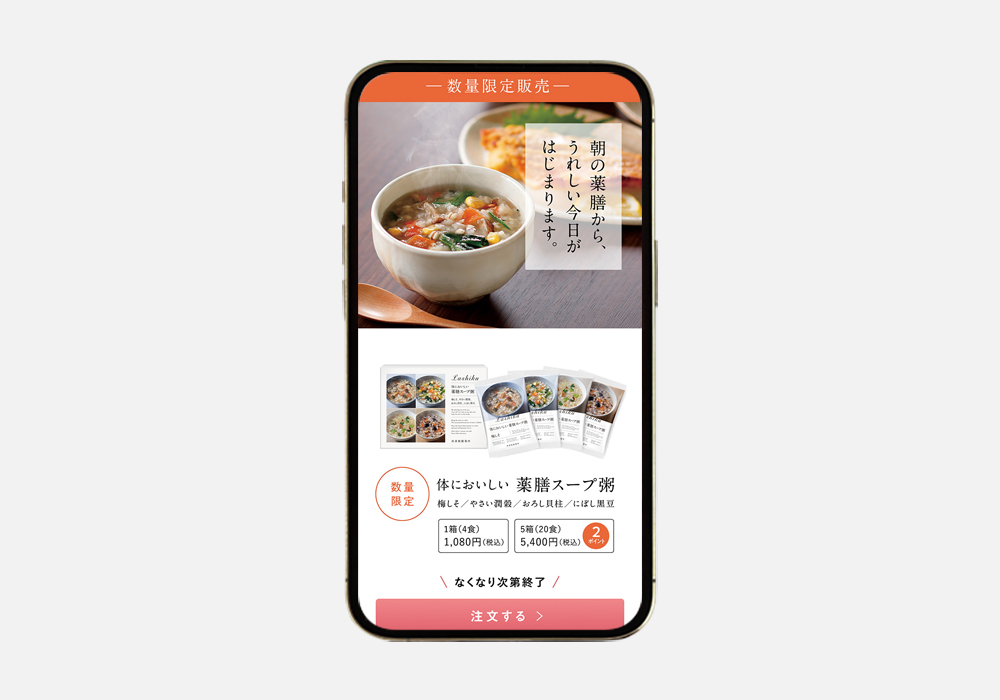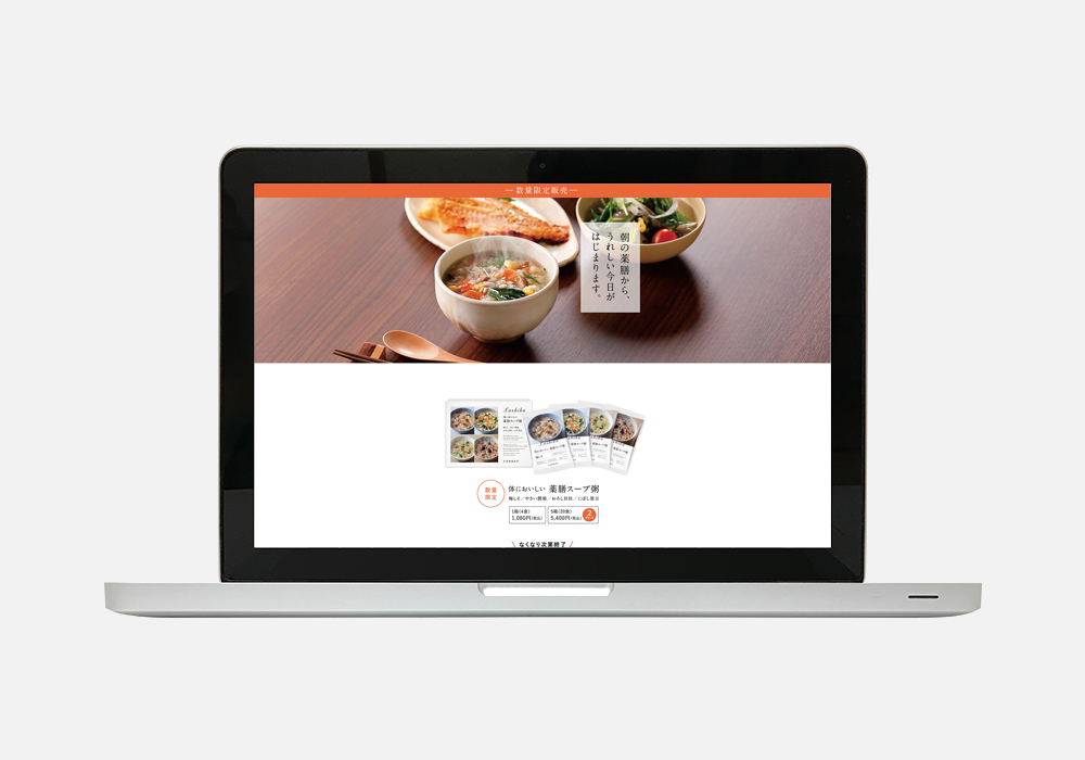 フリーズドライのスープ粥という初めての商材を告知したLPです。平面媒体をベースにSP版、PC版、バナーを一元で開発しました。